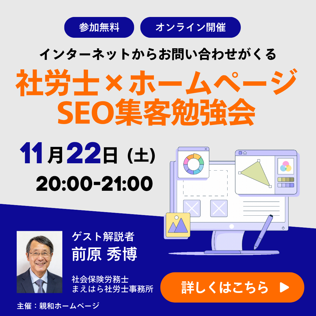 今回の「インターネットからお問い合わせがくる!社労士×ホームページ集客勉強会」では、親和ホームページ代表がMCを務めながら、社労士の前原秀博先生に障害年金専門のホームページ制作のコツを伺います。